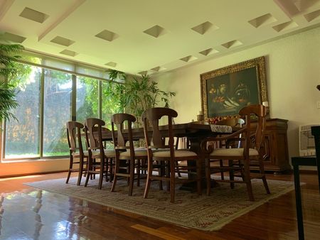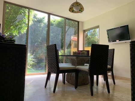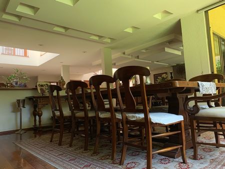 Preciosa casa en condominio, en buen estado de conservación, en dos niveles, sala y comedor, cocina equipada, antecomedor, estudio o biblioteca, sala de tv, 3 recámaras cada una con baño completo, más medio baño de visitas, jacuzzi, servicios integrados, precioso jardín de 180 m2. 5 autos. Sólo 4 casas, vigilancia 24 horas. Mant. $6,000.00